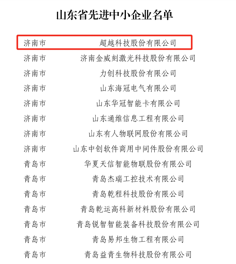近日,山東省工信廳對榮獲山東省首批先進中小企業(yè)稱號的名單予以公示,全省100家企業(yè)入選。超越科技憑借高創(chuàng)新性、高成長性成功登榜并榮登榜首。